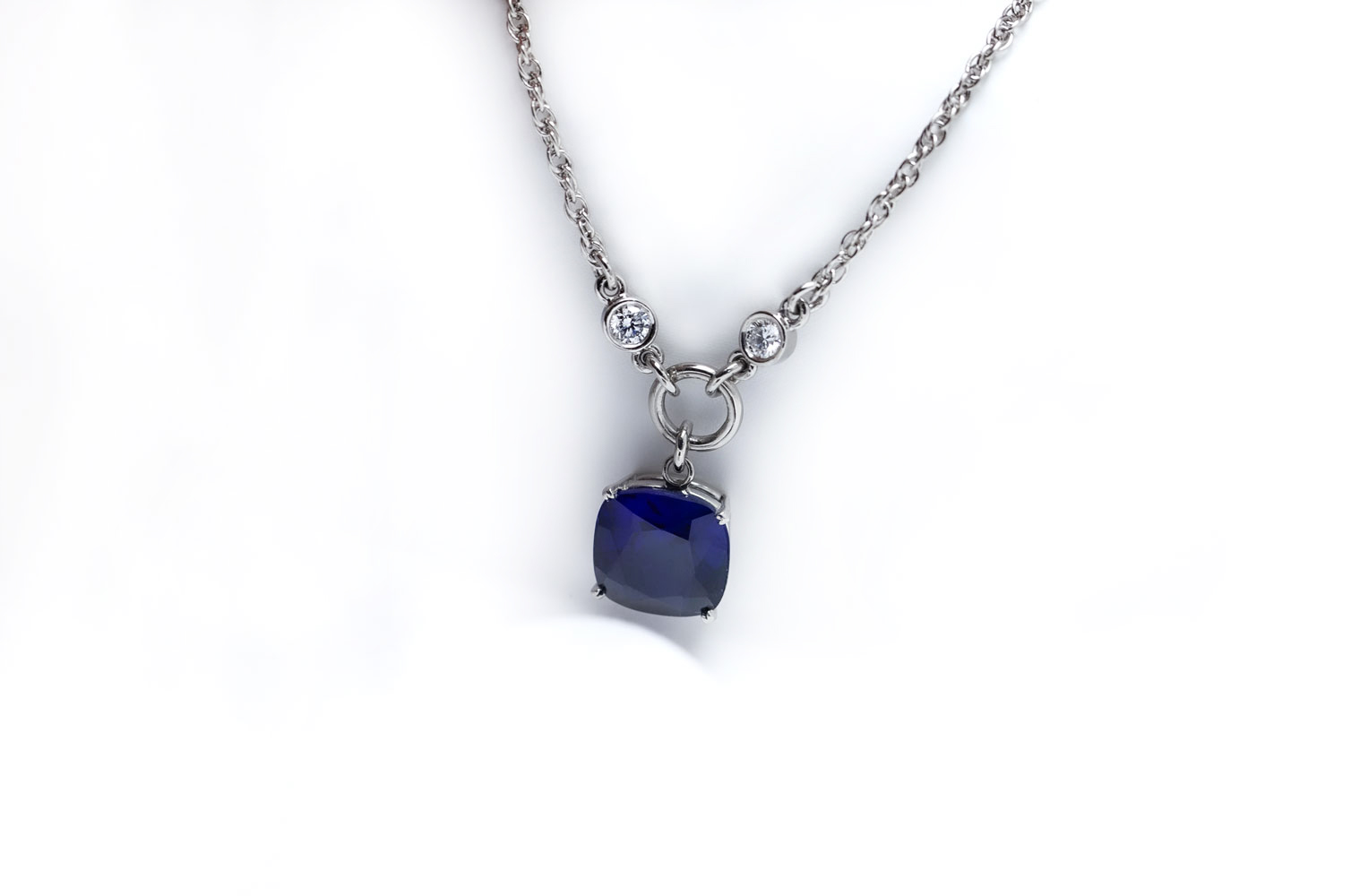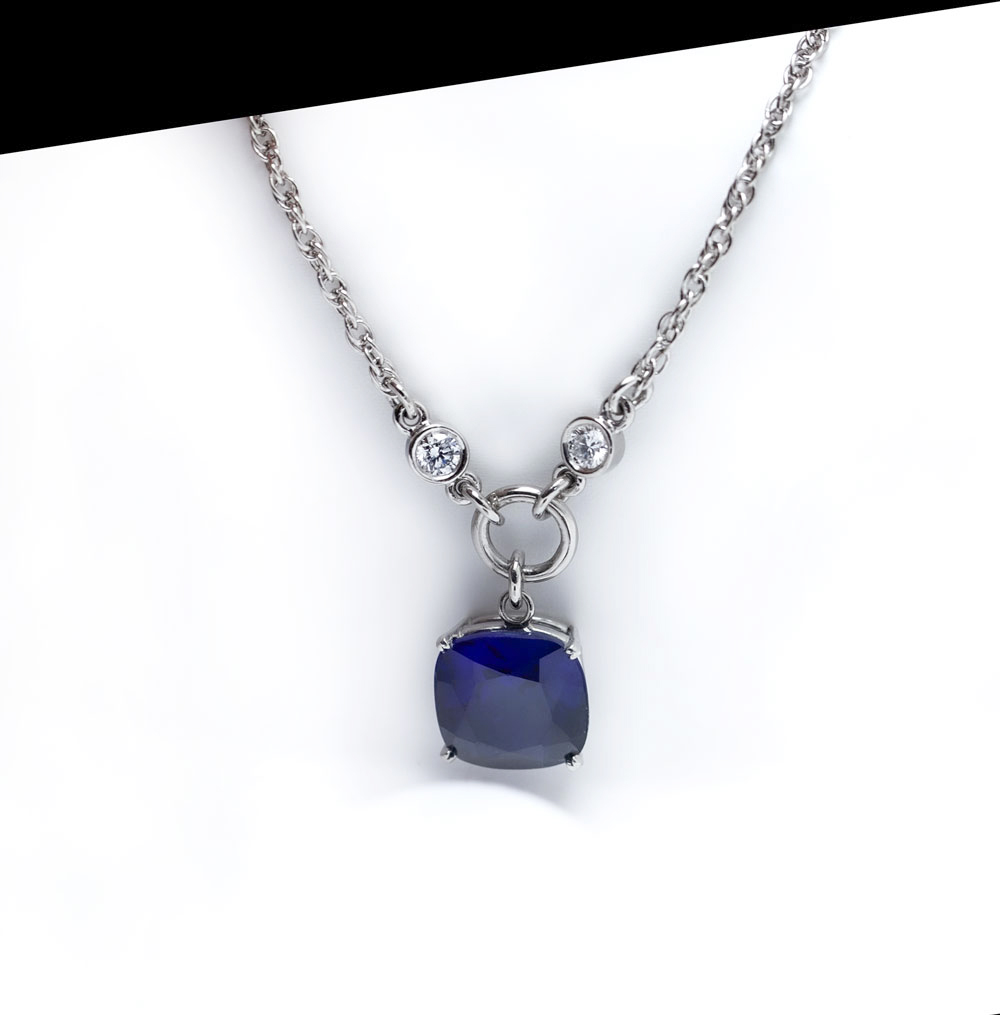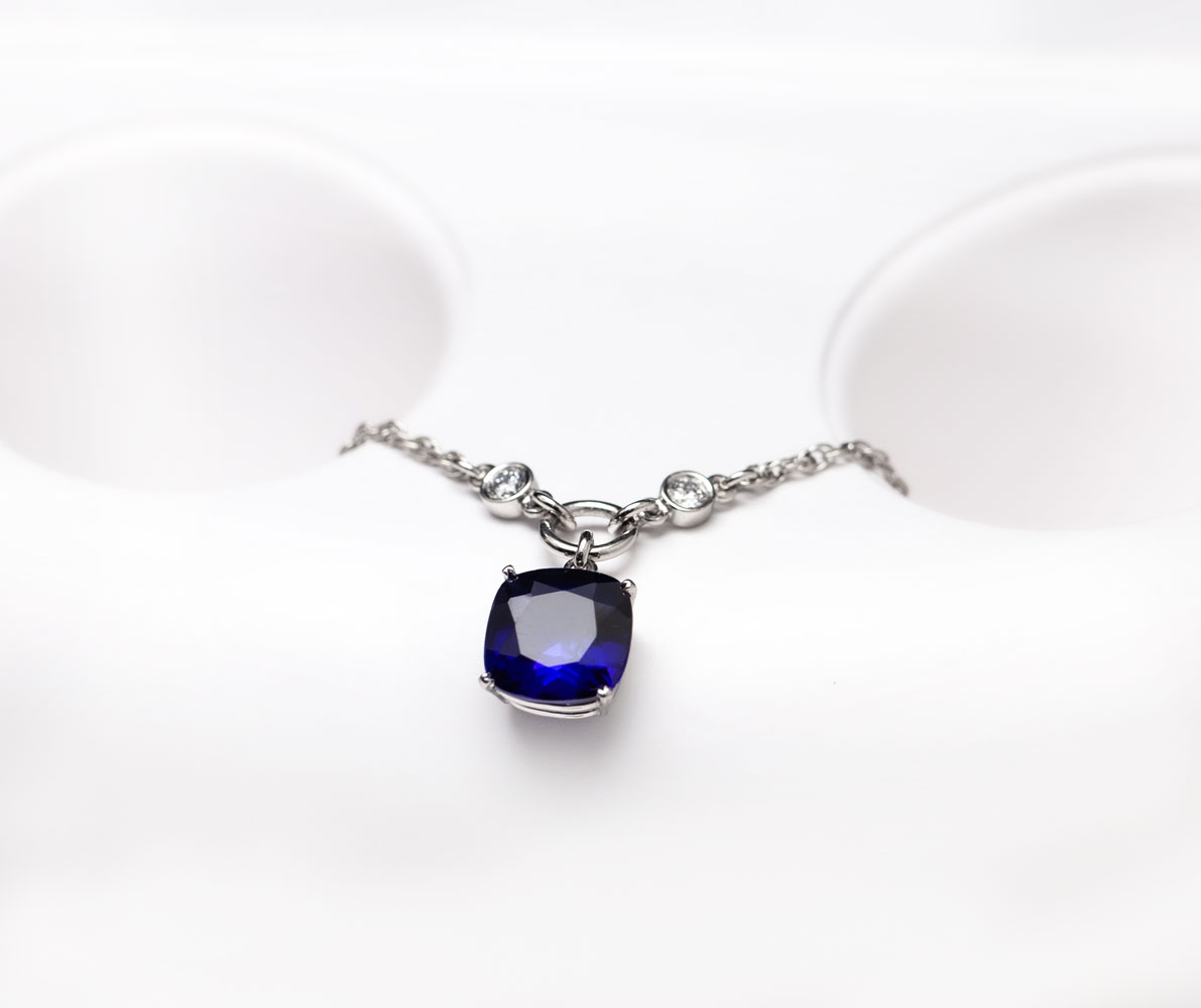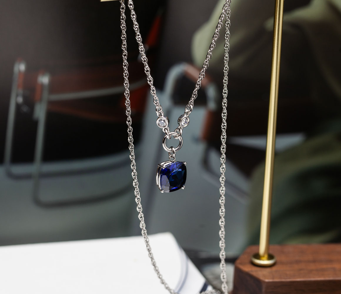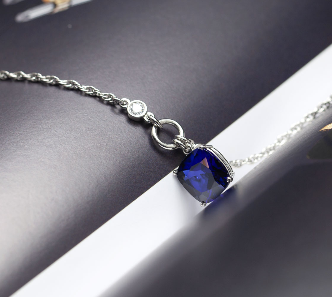 펜던트 위아래로 세팅된 랩 그로운 다이아가 사파이어의 색감을 더욱 또렷하게 살려주며,